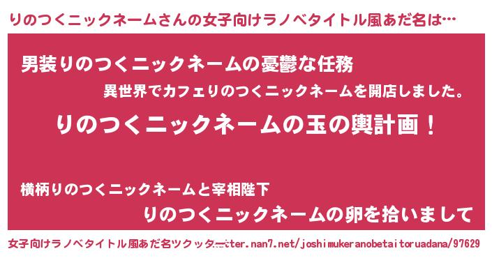 | 男性向けラノベタイトル風あだ名 | 『りのつくニックネーム~年齢イコール彼女いない歴の魔法使い~』 |