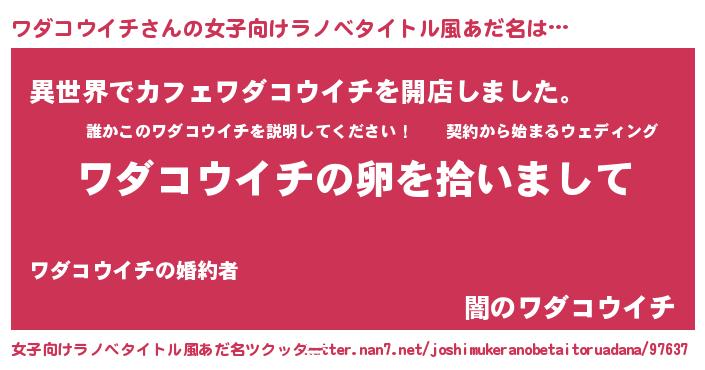 ワダコウイチさんの女子向けラノベタイトル風あだ名は… 『ワダコウイチの卵を拾いまして』『異世界でカフェワダコウイチを開店しました。』『闇のワダコウイチ』 ツクッター #女子向けラノベタイトル風あだ名ツクッター http://tkutter.nan7.net/joshimukeranobetaitoruadana/97637/