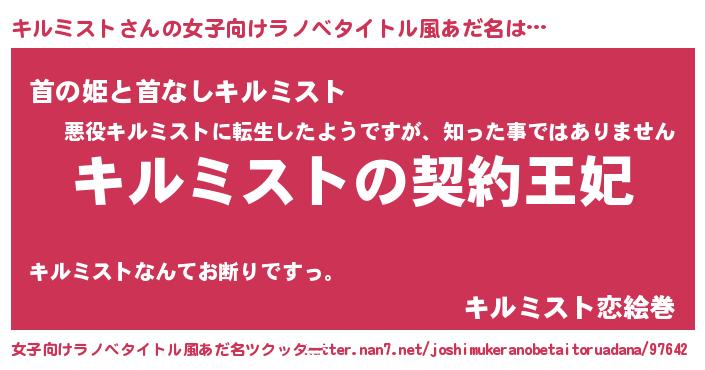 キルミストさんの女子向けラノベタイトル風あだ名は… 『キルミストの契約王妃』『首の姫と首なしキルミスト』『キルミスト恋絵巻』 ツクッター #女子向けラノベタイトル風あだ名ツクッター http://tkutter.nan7.net/joshimukeranobetaitoruadana/97642/