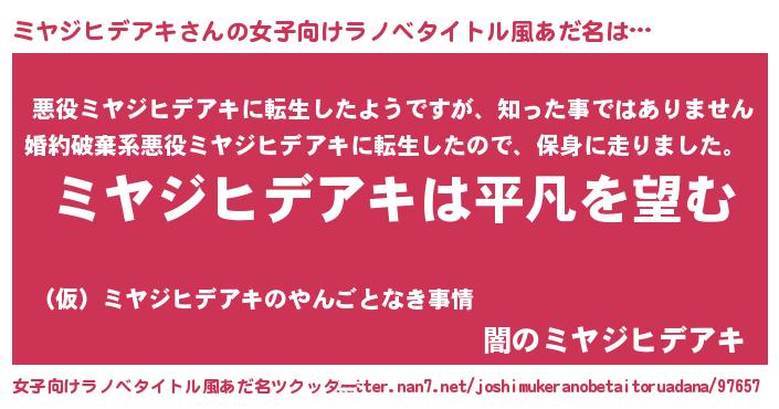 | 男性向けラノベタイトル風あだ名 | 『ダンジョンにミヤジヒデアキを求めるのは間違っているだろうか』 |