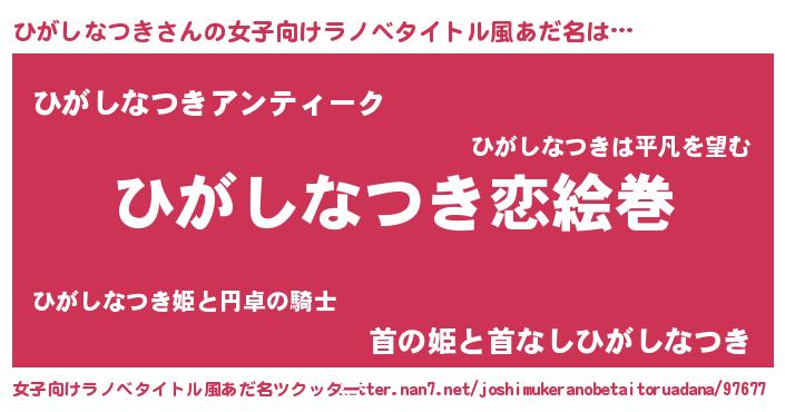 | 男性向けラノベタイトル風あだ名 | 『おまえをオタクにしてやるから、俺をひがしなつきにしてくれ! 』 |