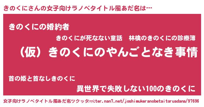 | 男性向けラノベタイトル風あだ名 | 『きのくにの憂鬱』『魔弾の王ときのくに』 |
