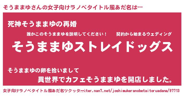 そうままゆさんの女子向けラノベタイトル風あだ名は… 『そうままゆストレイドッグス』『死神そうままゆの再婚』『異世界でカフェそうままゆを開店しました。』 ツクッター #女子向けラノベタイトル風あだ名ツクッター http://tkutter.nan7.net/joshimukeranobetaitoruadana/97713/