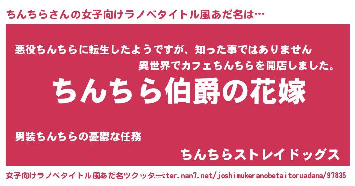 | 男性向けラノベタイトル風あだ名 | 『うちの娘の為ならば、俺はもしかしたらちんちらも倒せるかもしれない。』 |
