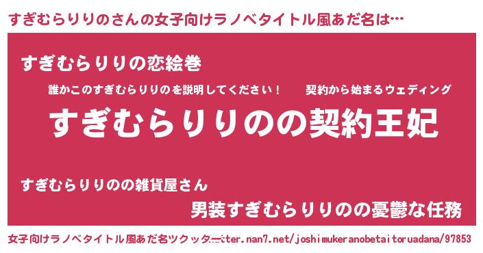 すぎむらりりのさんの女子向けラノベタイトル風あだ名は… 『すぎむらりりのの契約王妃』『すぎむらりりの恋絵巻』『男装すぎむらりりのの憂鬱な任務』 ツクッター #女子向けラノベタイトル風あだ名ツクッター http://tkutter.nan7.net/joshimukeranobetaitoruadana/97853/