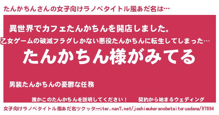 | 男性向けラノベタイトル風あだ名 | 『たんかちんの嫁は女の子じゃないと思った?』 |