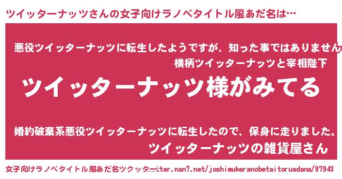 ツイッターナッツさんの女子向けラノベタイトル風あだ名は… 『ツイッターナッツ様がみてる』『悪役ツイッターナッツに転生したようですが、知った事ではありません』『ツイッターナッツの雑貨屋さん』 ツクッター #女子向けラノベタイトル風あだ名ツクッター http://tkutter.nan7.net/joshimukeranobetaitoruadana/97943/
