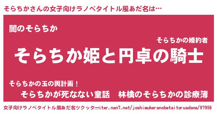 そらちかさんの女子向けラノベタイトル風あだ名は… 『そらちか姫と円卓の騎士』『闇のそらちか』『そらちかが死なない童話 林檎のそらちかの診療簿』 ツクッター #女子向けラノベタイトル風あだ名ツクッター http://tkutter.nan7.net/joshimukeranobetaitoruadana/97956/