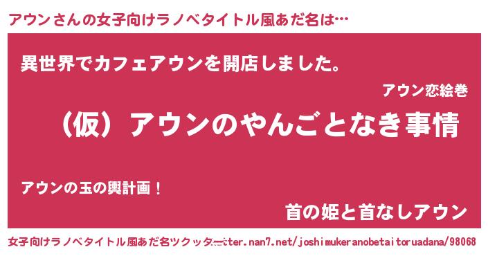 | 男性向けラノベタイトル風あだ名 | 『アウンの憂鬱』『はたらくアウンさま!』 |
