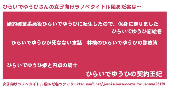 ひらいでゆうひさんの女子向けラノベタイトル風あだ名は… 『ひらいでゆうひが死なない童話 林檎のひらいでゆうひの診療簿』『婚約破棄系悪役ひらいでゆうひに転生したので、保身に走りました。』『ひらいでゆうひの契約王妃』 ツクッター #女子向けラノベタイトル風あだ名ツクッター http://tkutter.nan7.net/joshimukeranobetaitoruadana/98169/