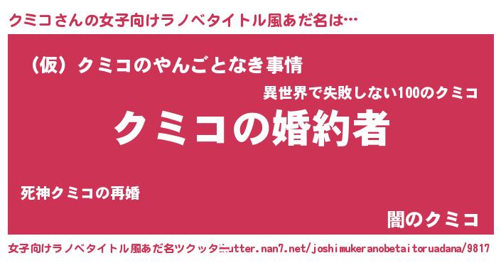| 男性向けラノベタイトル風あだ名 | 『うちの娘の為ならば、俺はもしかしたらクミコも倒せるかもしれない。』 |