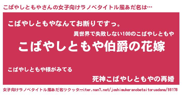 | 男性向けラノベタイトル風あだ名 | 『やはりこばやしともやの青春ラブコメはまちがっている 』 |