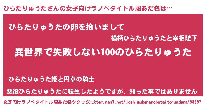 | 男性向けラノベタイトル風あだ名 | 『ひらたりゅうたという概念が存在しない退屈な世界 』 |