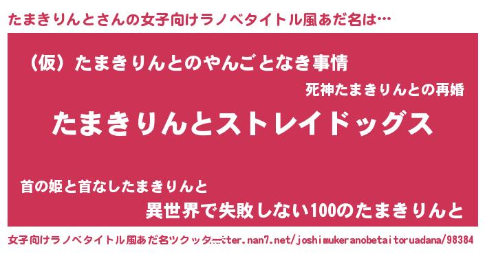 | 男性向けラノベタイトル風あだ名 | 『Re:たまきりんとから始める異世界生活』 |