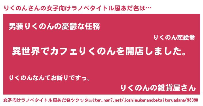 りくのんさんの女子向けラノベタイトル風あだ名は… 『異世界でカフェりくのんを開店しました。』『男装りくのんの憂鬱な任務』『りくのんの雑貨屋さん』 ツクッター #女子向けラノベタイトル風あだ名ツクッター http://tkutter.nan7.net/joshimukeranobetaitoruadana/98390/