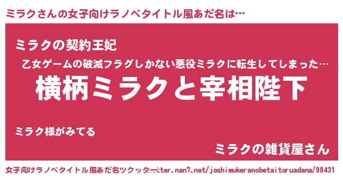 | 男性向けラノベタイトル風あだ名 | 『ミラクに滅ぼされるだけの簡単なお仕事です』 |