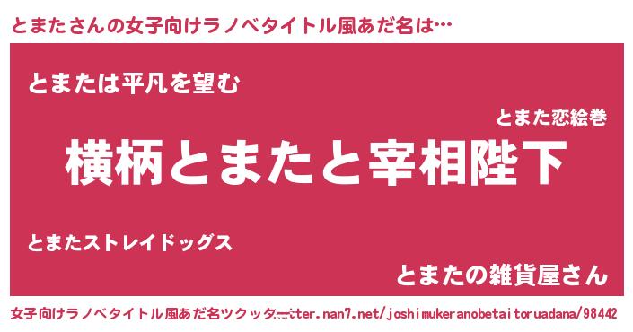 | 男性向けラノベタイトル風あだ名 | 『とまたに滅ぼされるだけの簡単なお仕事です』 |