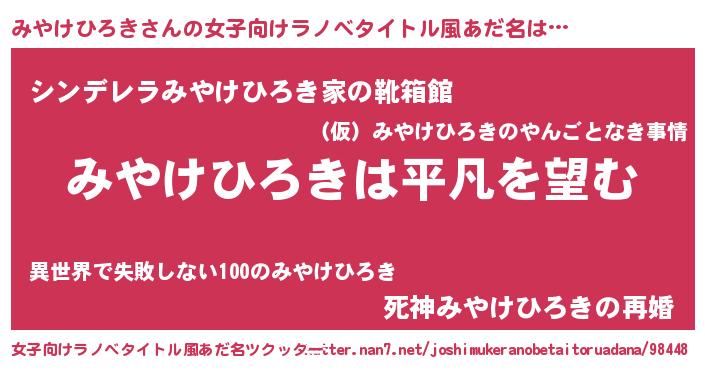 | 男性向けラノベタイトル風あだ名 | 『ダンジョンにみやけひろきを求めるのは間違っているだろうか』 |