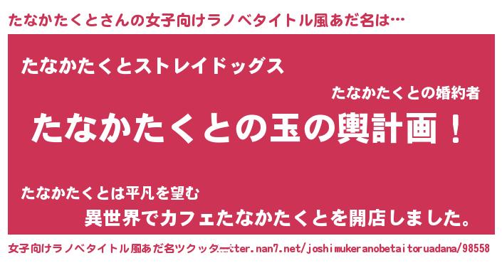 | 男性向けラノベタイトル風あだ名 | 『たなかたくと~年齢イコール彼女いない歴の魔法使い~』 |