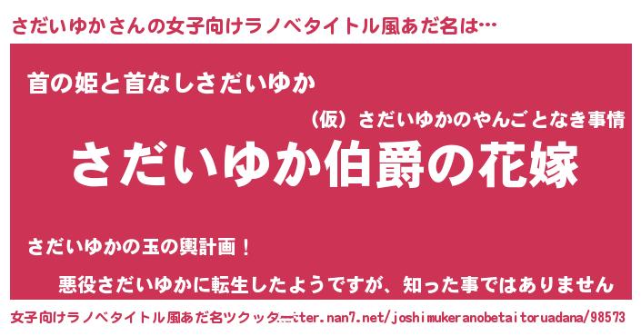 | 男性向けラノベタイトル風あだ名 | 『うちの娘の為ならば、俺はもしかしたらさだいゆかも倒せるかもしれない。』 |