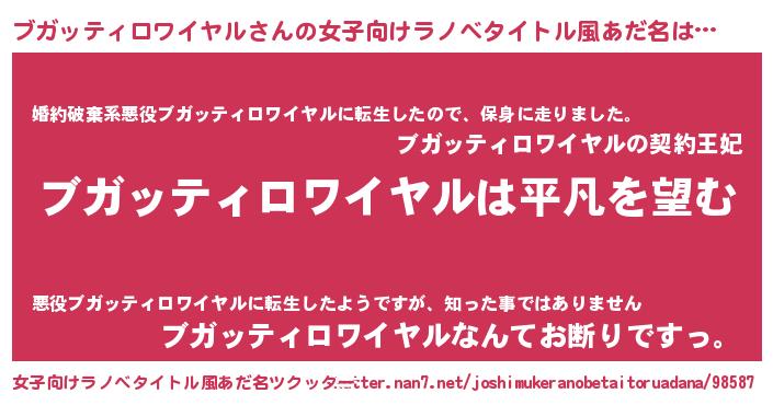 | 男性向けラノベタイトル風あだ名 | 『ダンジョンにブガッティロワイヤルを求めるのは間違っているだろうか』 |
