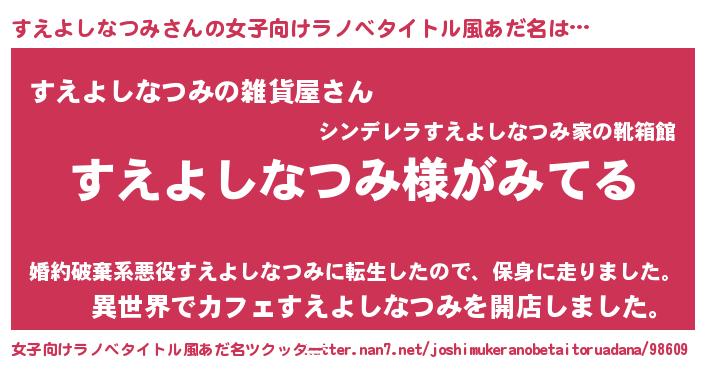 | 男性向けラノベタイトル風あだ名 | 『すえよしなつみの嫁は女の子じゃないと思った?』 |