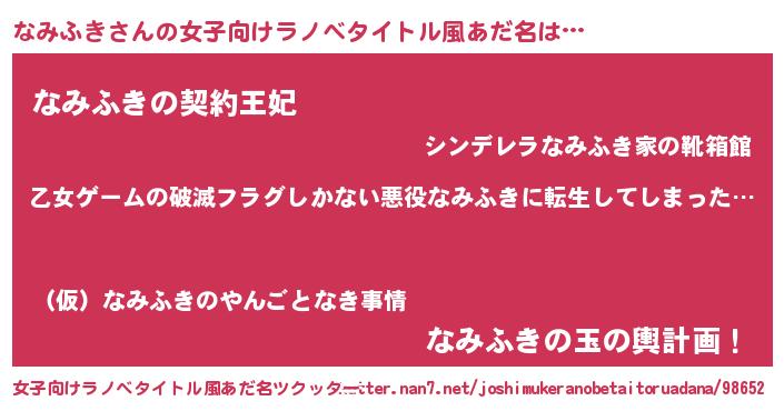 | 男性向けラノベタイトル風あだ名 | 『魔弾の王となみふき』『なみふきの憂鬱』 |
