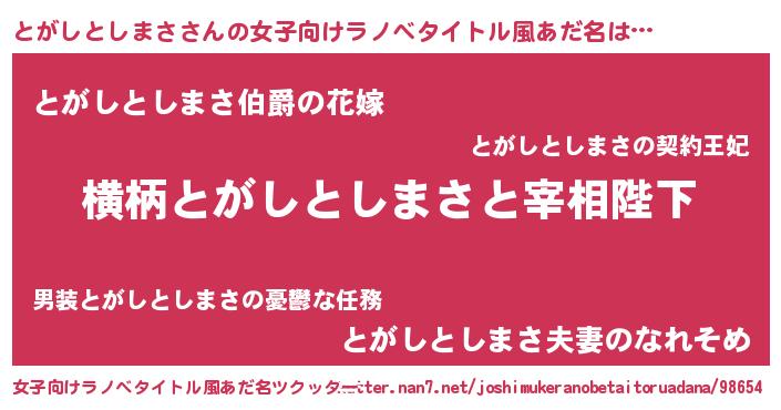 | 男性向けラノベタイトル風あだ名 | 『とがしとしまさに滅ぼされるだけの簡単なお仕事です』 |