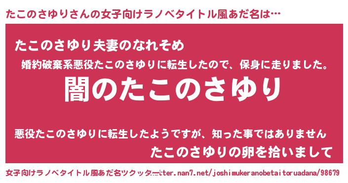 | 男性向けラノベタイトル風あだ名 | 『Re:たこのさゆりから始める異世界生活』 |
