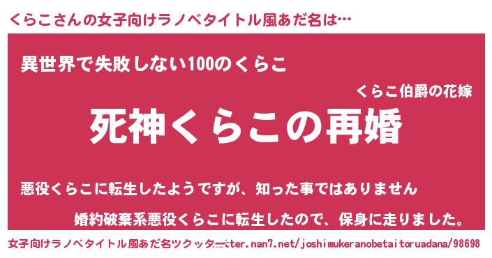 | 男性向けラノベタイトル風あだ名 | 『ノーゲーム・ノークラコ』 |