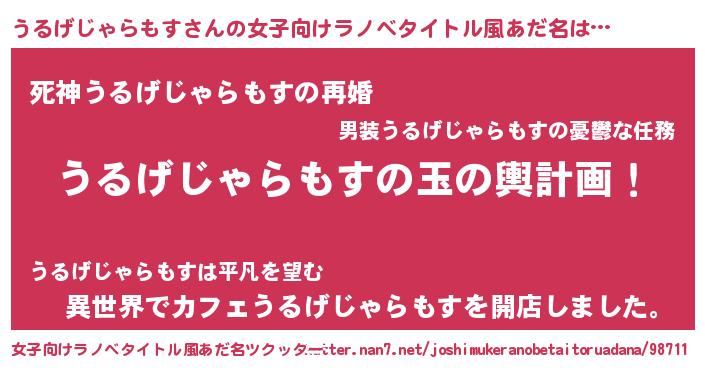 | 男性向けラノベタイトル風あだ名 | 『うるげじゃらもす~年齢イコール彼女いない歴の魔法使い~』 |