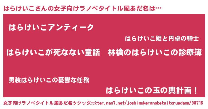 | 男性向けラノベタイトル風あだ名 | 『魔弾の王とはらけいこ』 |