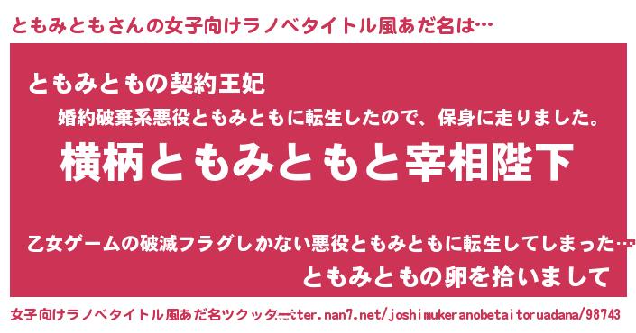 | 男性向けラノベタイトル風あだ名 | 『ともみともに滅ぼされるだけの簡単なお仕事です』 |
