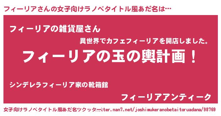 | 男性向けラノベタイトル風あだ名 | 『フィーリア~年齢イコール彼女いない歴の魔法使い~』 |