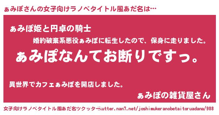 | 意味不明あだ名 | 『自称ぁみぽ』『ペロリンぁみぽ』 |