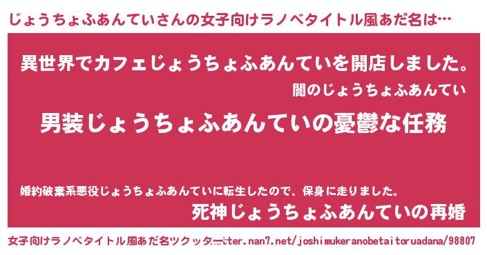 | 男性向けラノベタイトル風あだ名 | 『うちのじょうちょふあんていが世界を掌握している!』 |
