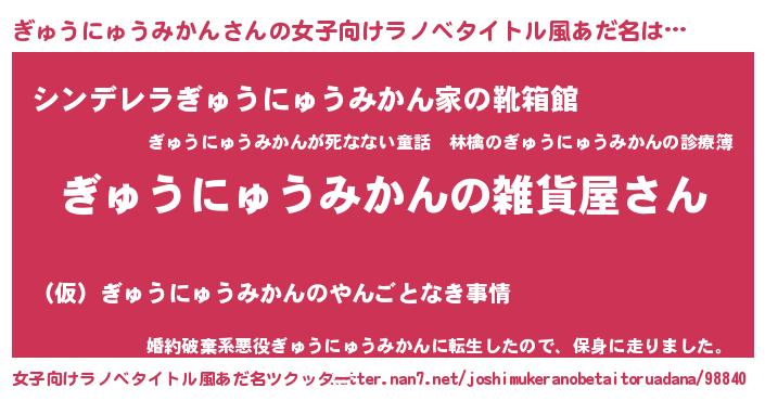 ぎゅうにゅうみかんさんの女子向けラノベタイトル風あだ名は… 『ぎゅうにゅうみかんの雑貨屋さん』『シンデレラぎゅうにゅうみかん家の靴箱館』『婚約破棄系悪役ぎゅうにゅうみかんに転生したので、保身に走りました。』 ツクッター #女子向けラノベタイトル風あだ名ツクッター http://tkutter.nan7.net/joshimukeranobetaitoruadana/98840/