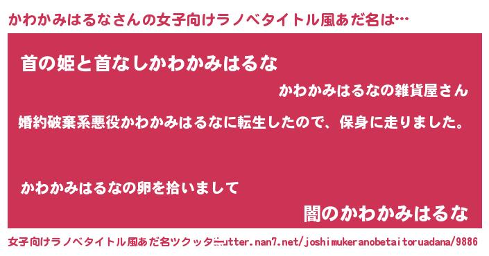 | 男性向けラノベタイトル風あだ名 | 『転生したらかわかみはるなだった件』 |