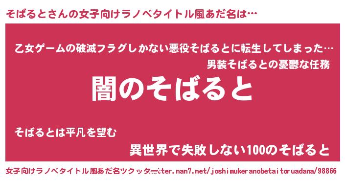 | 男性向けラノベタイトル風あだ名 | 『Re:そばるとから始める異世界生活』 |