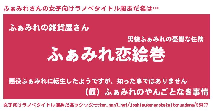 | 男性向けラノベタイトル風あだ名 | 『おまえをオタクにしてやるから、俺をふぁみれにしてくれ! 』 |