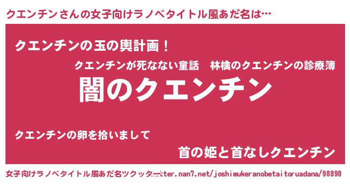 | 男性向けラノベタイトル風あだ名 | 『Re:クエンチンから始める異世界生活』 |
