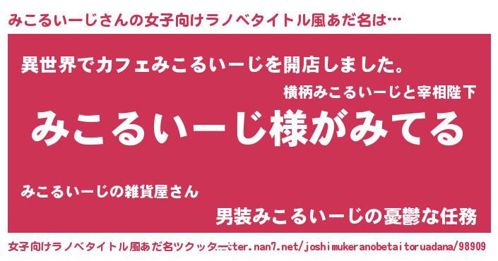 | 男性向けラノベタイトル風あだ名 | 『みこるいーじの嫁は女の子じゃないと思った?』 |