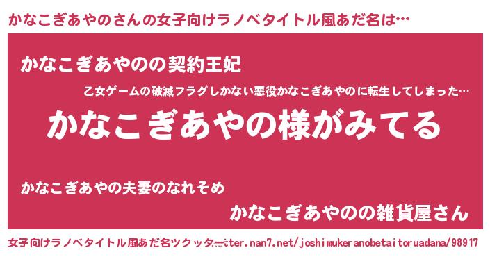 | 男性向けラノベタイトル風あだ名 | 『かなこぎあやのの嫁は女の子じゃないと思った?』 |