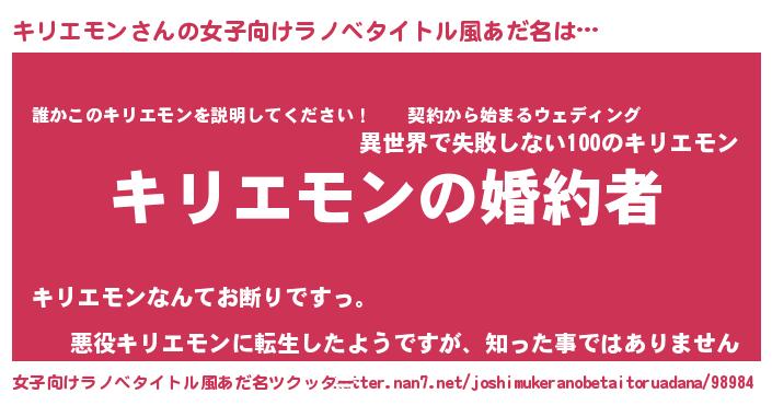| 男性向けラノベタイトル風あだ名 | 『うちの娘の為ならば、俺はもしかしたらキリエモンも倒せるかもしれない。』 |