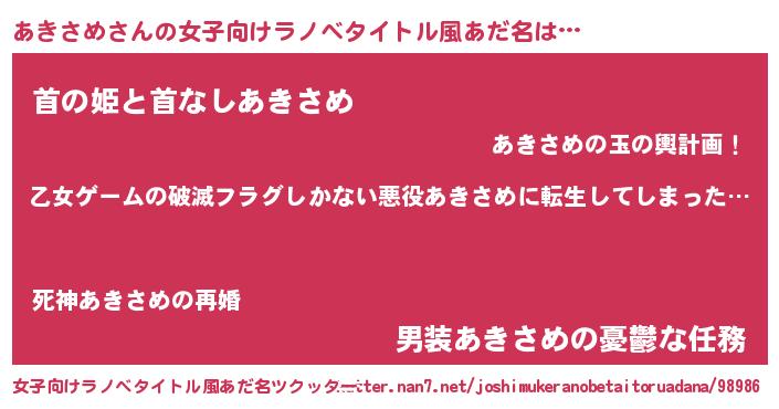 | 男性向けラノベタイトル風あだ名 | 『この素晴らしい世界にあきさめを!』 |