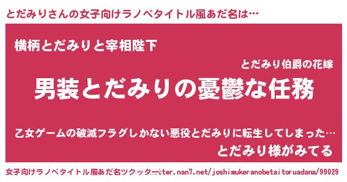 | 男性向けラノベタイトル風あだ名 | 『うちのとだみりが世界を掌握している!』 |