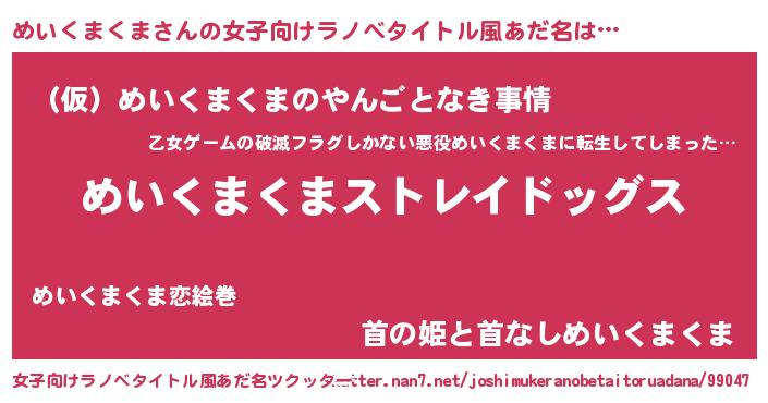 | 男性向けラノベタイトル風あだ名 | 『Re:めいくまくまから始める異世界生活』 |