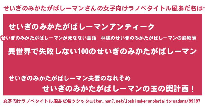 | 男性向けラノベタイトル風あだ名 | 『せいぎのみかたがばしーマンという概念が存在しない退屈な世界 』 |