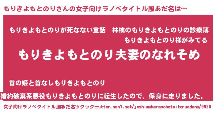 | 男性向けラノベタイトル風あだ名 | 『おまえをオタクにしてやるから、俺をもりきよもとのりにしてくれ! 』 |