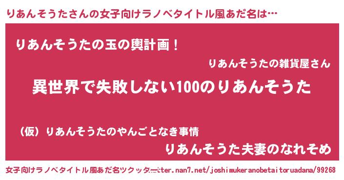 | 男性向けラノベタイトル風あだ名 | 『りあんそうたという概念が存在しない退屈な世界 』 |